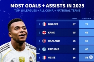 体育资讯1月2日讯 2025年已经过去,《转会市场》也统计了2025前15联赛球员的俱乐部+国家队各项赛事总参与进球情况,皇马前锋姆巴佩领跑。