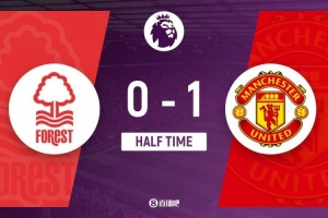 伤停补时3分钟。上半场比赛结束,诺丁汉森林0-1曼联。