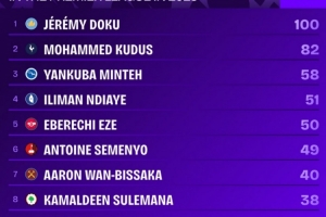 体育资讯11月10日讯 英超第11轮比赛,多库完成7次过人,打进1球,帮助曼城3-0击败利物浦。据Squawka统计,多库是2025年首位英超成功过人达到100次的球员。