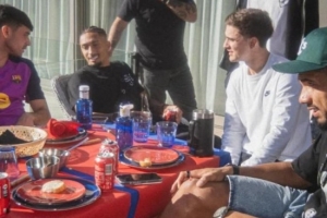 阿劳霍积极倡导这类团队活动,拉菲尼亚也在Instagram中分享了多张聚餐照片。我们可以看到阿劳霍与队友们以及包括理疗师在内的俱乐部员工围坐在餐桌旁,桌上铺着蓝红相间的桌布,彰显了对俱乐部的热爱。